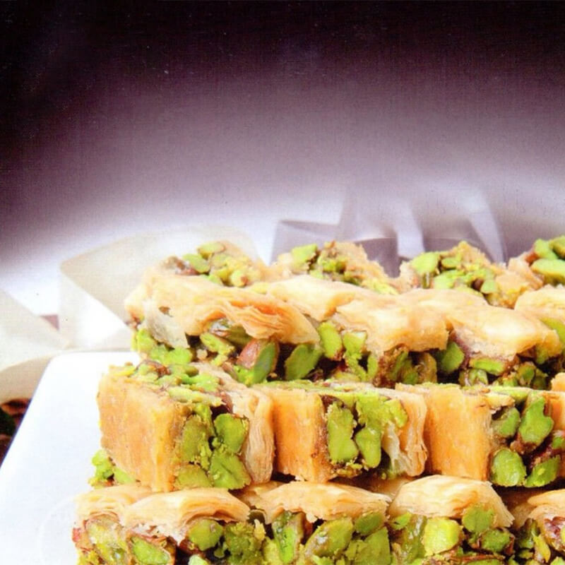 طبقتان من عجينة الفيلو المقرمشة ومحشوة بالفستق المكسر.