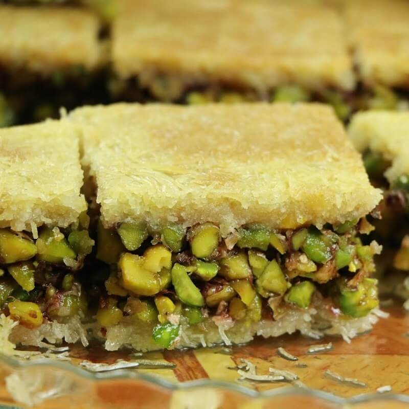 رقائق عجين مقرمشة متعددة تغلف طبقة من الفستق